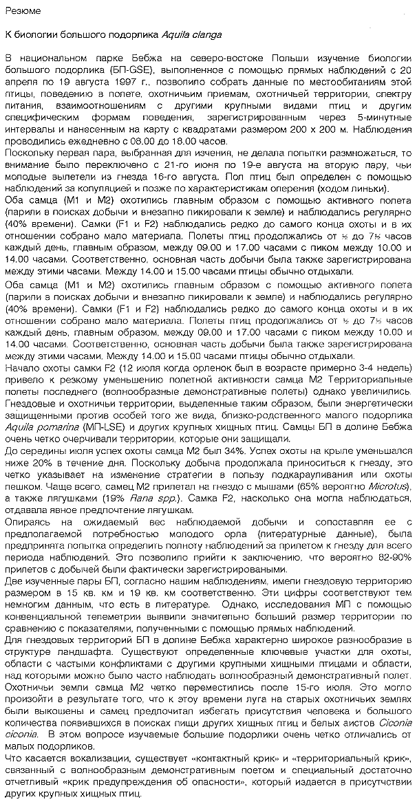 BERNHARD KOMISCHKE, KAI GRASZYNSKI und BERND-ULRICH MEYBURG In the Biebrza National Park in North-east Poland a study of Greater Spotted Eagles (GSE), carried out by direct observation from 20 April until 19 August 1997, provided many data on the birds'home range, flight behaviour, hunting methods, hunting territory, prey composition interaction with other large birds and other specific forms of behaviour, recorded at five-minute intervals and plotted on map quadrants 200 x 200 m in size. The observations were carried out every day from 8.00 until 18.00 hrs. Since the first pair selected for study made no attempt to breed, attention was shifted between 21st June and 19th August to a second pair, whose young fledged on 16th August. The sexes were determined by observation of copulations and, thereafter, by plumage characteristics (moulting patterns). Both males (M 1 and M2) hunted chiefly on the wing (soaring in search of prey and stooping to the ground) and were regularly observable (40% of the time). The females (W 1 and W2) were seen only seldom out hunting, so that in their case there are gaps in the data. Flight activity lasted between ½ and 7 ½ hours per day, mainly between 9.00 and 17.00 hours with a peak between 10.00 and 14.00 hours. Accordingly the major proportion of prey was also recorded between these hours. Between 14.00 and 15.00 hours there was usually a rest period. The start of hunting by W2 (on 12 July when the eaglet was about 3-4 weeks old) led to a clear decline in M2īs flying activity. The latter's territorial flights (undulating display flights), however, increased. The breeding and hunting territories thus marked out were energetically defended against members of the same species, the closely related Lesser Spotied Eagle Aquila pomarina (LSE) and other large birds of prey. Male GSEs in the Biebrza valley probably have clearly defined territories which they defend. Up to mid-July the male's hunting success was 34%. The success of hunting on the wing declined to below 20% during the day. Since prey continued to be carried to the eyrie this clearly indicated a strategic change in favour of still-hunting er hunting on foot. For the most part M2 arrived with mice (65%, probably Microtus), also frogs (19%, Rana spp.) at the eyrie. W2, so far as she could be observed, showed a preference for frogs. Based on the estimated weight of the observed, as compared with the presumed, needs of the young eagle (data in literature), an attempt was made to determine the completeness of observations of arrivals with prey at the nest for the total period of observation. This led to the conclusion that probably 70% of the arrivals with prey were in fact observed. The two pairs of GSE studied had, according to out observations, home ranges of 15 km² and 19 km² respectively. These values correspond to those few given in the literature. However, studies of LSEs by conventional telemetry have revealed clearly larger home ranges than those assessed from direct observation. The breeding territories of GSEs in Biebrza valley showed a wide variety in the structure of the landscape. There were clearly certain key points for hunting, areas with frequent conflicts with other large birds of prey, and areas over which undulating display flights were frequently performed. The hunting grounds of M2 plainly shifted after 12th July. This could have resulted from the fact that by this date the meadows in the old hunting territory had been mown und the male preferred to avoid human activities and the large numbers now appearing of other raptors and White Storks Ciconia ciconia in search of prey. In this the GSEs studied clearly differ from the closely related LSE. As regards vocalisations, there was a "contact call", a "territorial call" connected with the undulating display flights and a special, quite distinct "warning call" which was audible when other large birds of prey were arround. Key words: Greater Spotted Eagle, Aquila clanga, behaviour, home range, habitat utilisation, territoriality, voice, food. Zusammenfassung Im Biebrza Nationalpark (Nordost-Polen) wurden beim Schelladler während der Brutperiode 1997 durch direkte Beobachtung Daten zum home range, zu Flugaktivität, Jagdweise, Jagdgebiet, Beutespektrum, Interaktion mit anderen Großvögeln und anderen definierten Verhaltensweisen in einem zeitlichen Rastervonjeweils 5 min gesammelt und einem geographischen Raster mit Planquadraten von 200 m Kantenlänge zugeordnet. Da das zunächst vom 20.04. bis 19.06. beobachtete Paar (P1) keinen Brutversuch unternahm, wurde die Untersuchung vom 21.6. bis 19.8. an einem zweiten Paar (P2) fortgesetzt, dessen Jungvogel am 16.8. ausflog. Die Geschlechtsbestimmung erfolgte durch Beobachtung von Kopulationen und danach anhand von Gefiedermerkmalen (Mauserlücken). Beide Männchen (M 1 und M2) jagten vorwiegend aus dem Suchflug heraus und waren regelmäßig (im Mittel 40% maximal 70% der Beobachtungszeit) zu beobachten. Die Weibchen (W 1 und W2) wurden nur selten auf der Jagd beobachtet, so daß hier die Daten lückenhaft sind. Flugaktivität wurde ½ bis 7 ½ Stunden pro Tag, hauptsächlich von 9:00 bis 17:00 Uhr mit einem Maximum zwischen 10:00 und 14:00 beobachtet. Dementsprechend wurde auch zwischen 10:00 und 14:00 der Hauptanteil der Beute eingetragen. Zwischen 14:00 und 15:00 Uhr lag meist eine Ruhephase. Der Beginn der Jagd durch das W2 Mitte Juli führte zu einer deutlichen Verringerung der Flugaktivität des M2. Allerdings nahm dann bei diesem die Aktivität reviermarkierender Verhaltensweisen (Girlandenflüge) zu. Das Wohn- und Jagdgebiet wird vom M mit Hilfe der Girlandenflüge sehr nachdrücklich gegenüber Artgenossen, gegen die Schwesterart, den Schreiadler Aquila pomarina und andere größere Greifvögel markiert. Wahrscheinlich haben Schelladler-Männchen im Biebrza-Gebiet echte verteidigte Reviere. Vor Mitte Juli liegt der Erfolg des M bei der Jagd aus dem Suchflug bei 34 %. Im Tagesverla